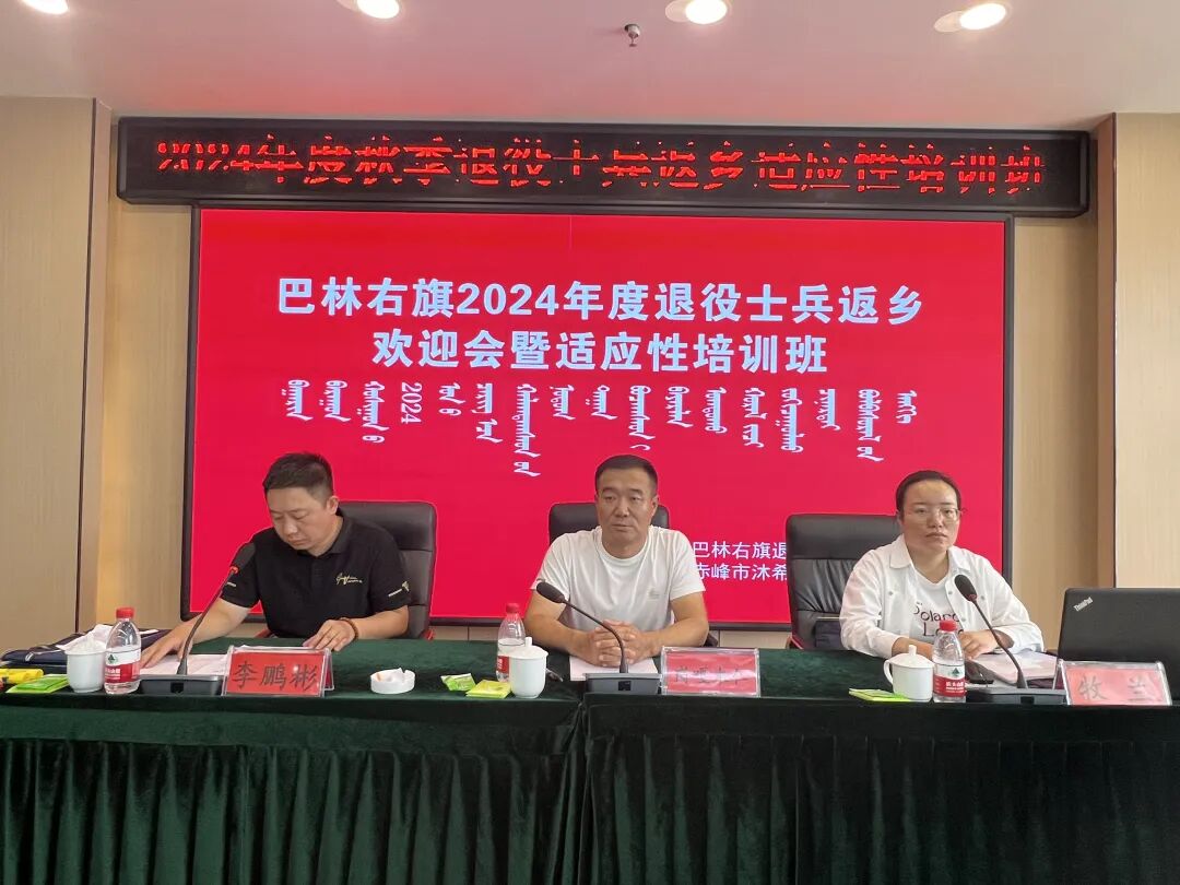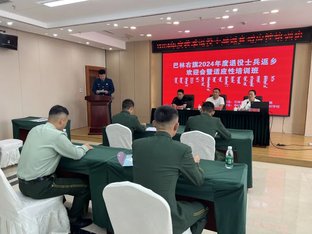 为做好军事人力资源培育转化,帮助返乡退役士兵尽快完成角色转换,9 月9日下午,巴林右旗退役军人事务局联合赤峰沐希职业技术学校举办巴林右旗 2024 年度退役士兵返乡欢迎仪式暨适应性培训班开班活动,主办、承办单位的相关负责人和工作人员以及24名退役士兵参加开班仪式,开班仪式由旗退役军人事务局副局长岗嘎木仁主持。