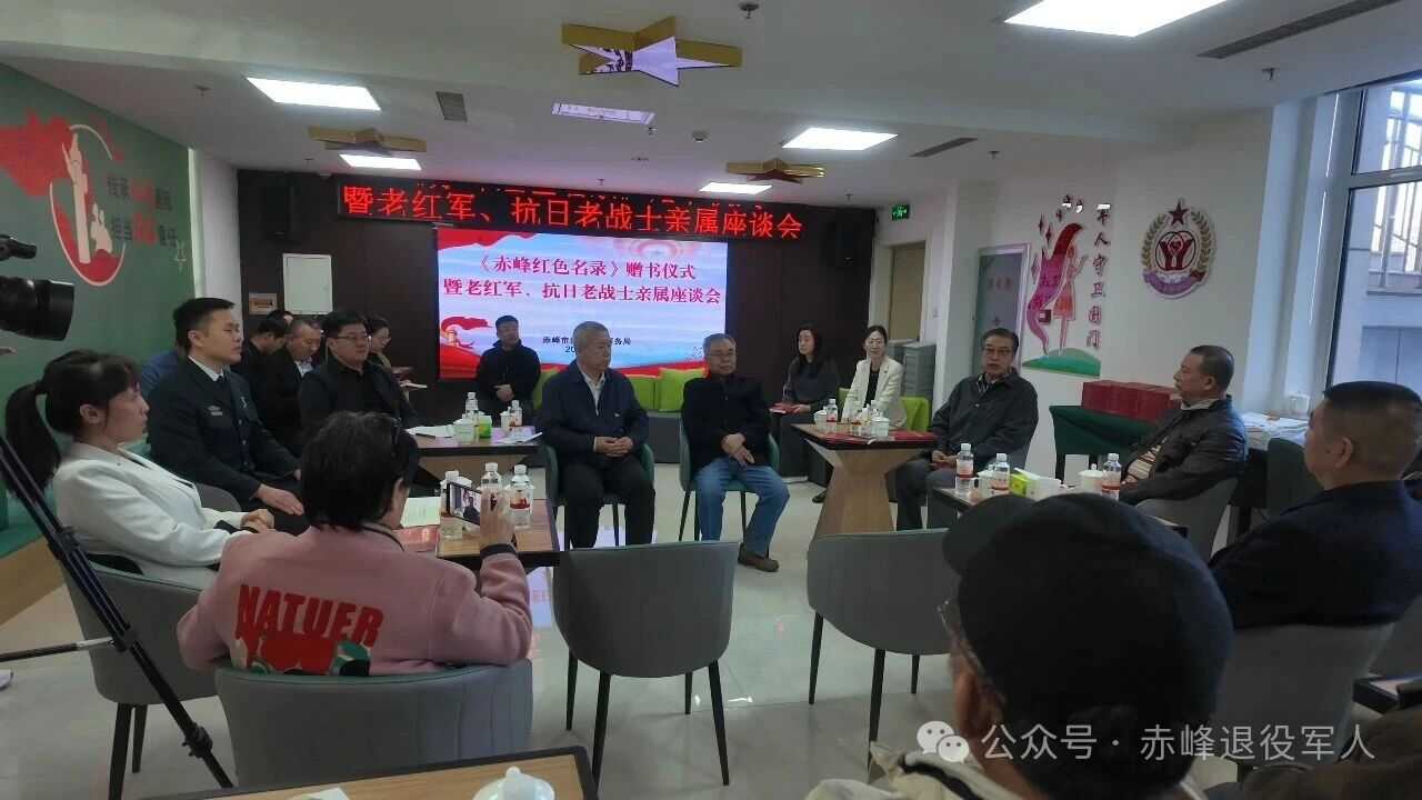 3月27日上午,由赤峰市退役军人事务局主办的《赤峰红色名录》赠书仪式暨老红军、抗日老战士家属座谈会在市退役军人服务中心会议室举行。市退役军人事务局党组书记、局长王冰,局党组成员、副局长仪修泉,赤峰军分区政治工作处干事王文浩出席活动。活动邀请了《赤峰红色名录》编辑顾问代表及部分老红军、抗日老战士家属代表参加。活动的开展,旨在纪念中国人民抗日战争暨世界反法西斯战争的伟大胜利,纪念中国工农红军长征胜利90周年,缅怀革命英烈,传承红色基因。