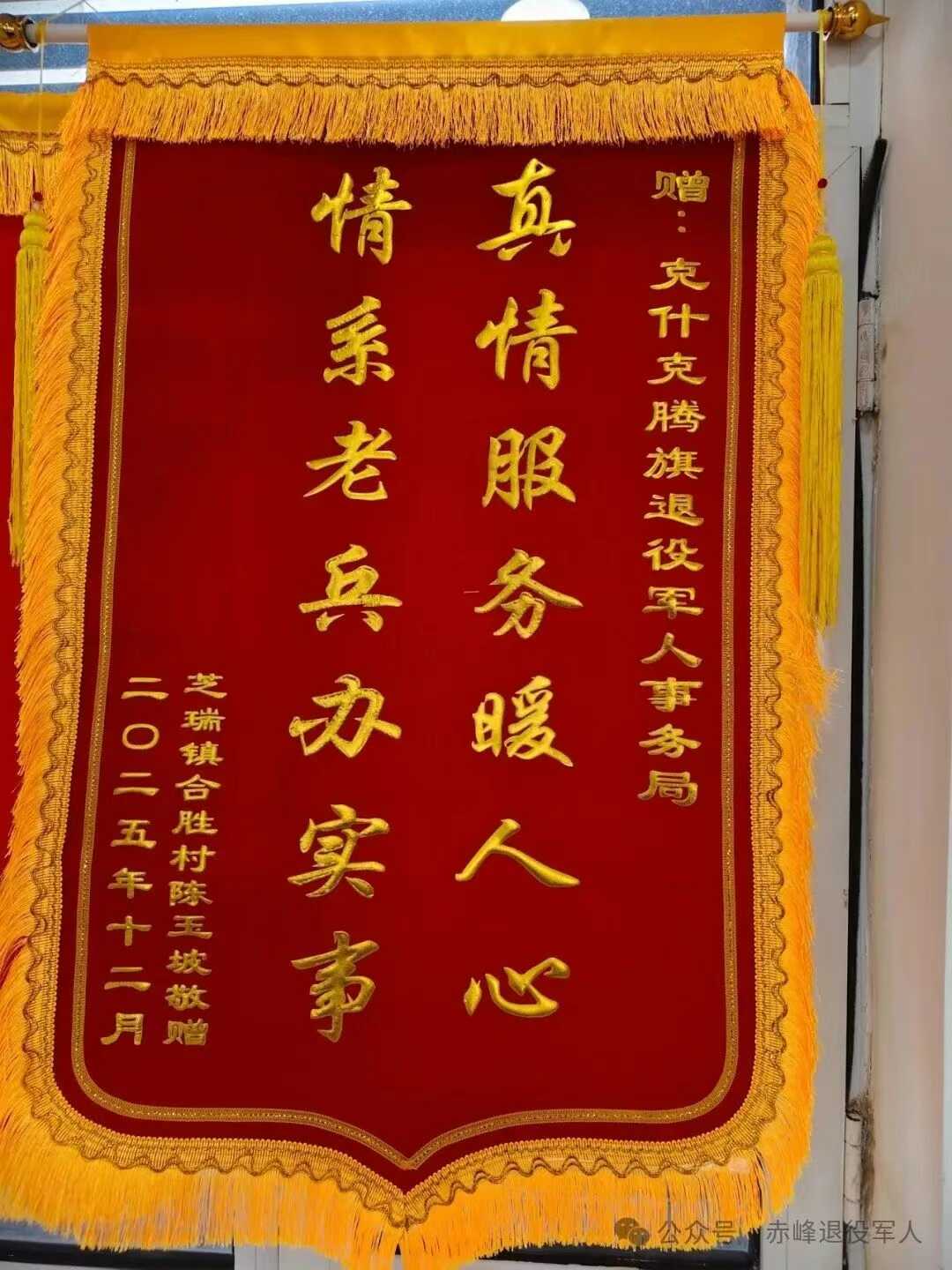 12月15日,一面印着“真情服务暖人心,情系老兵办实事”的锦旗,由芝瑞镇副镇长张一帅、合胜村书记郭明、镇退役军人服务站工作人员籍文杰代为送至我旗退役军人事务局,这是我旗重点优抚对象陈玉坡委托三人送来的一份特殊谢意。